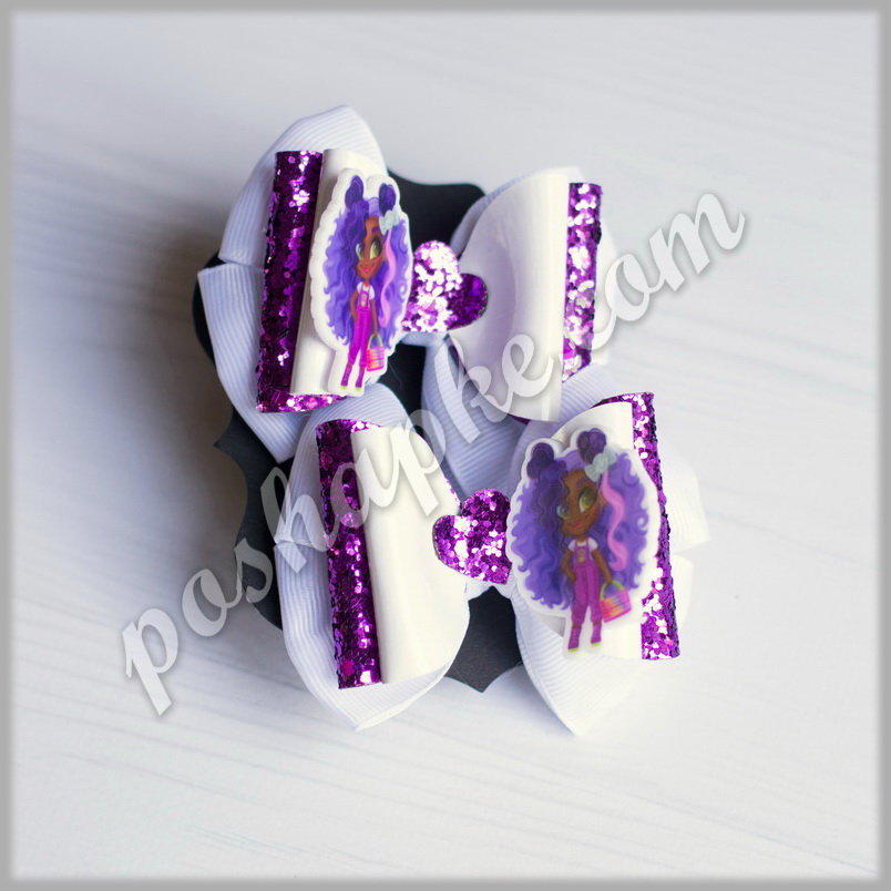 Размер 8х7 см, крепление — бесшовная резинка. Материалы — репсовая лента, глиттерная и лаковая экокожа.